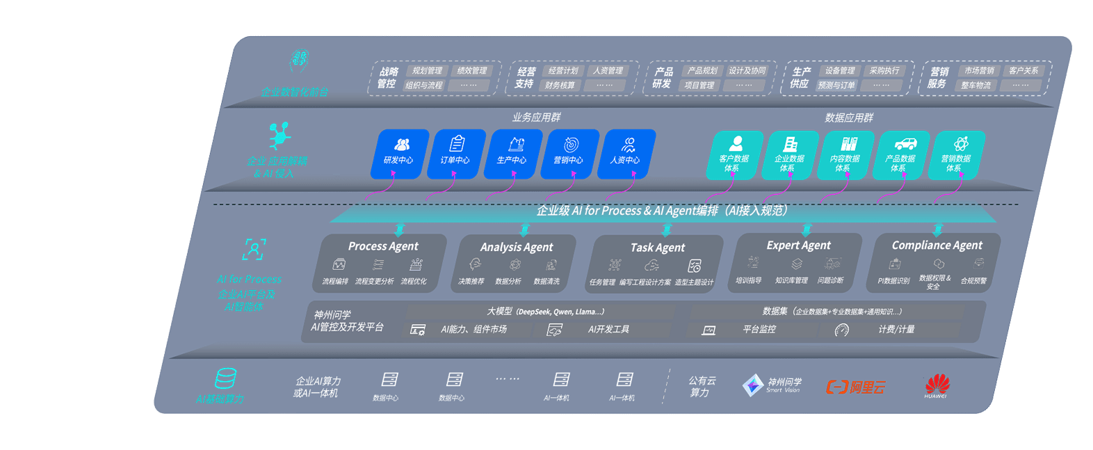 端到端的一站式AI工作空间深度融合了从企业战略规划到日常经营的全流程业务板块,,,,定向解决车企内部领域多、、部门多、、、链条长、、场景碎片化等难题,,,支持车企快速构建以AI为核心的生产力写作体系,,,,实现任务执行与AI能力的无缝集成与交互