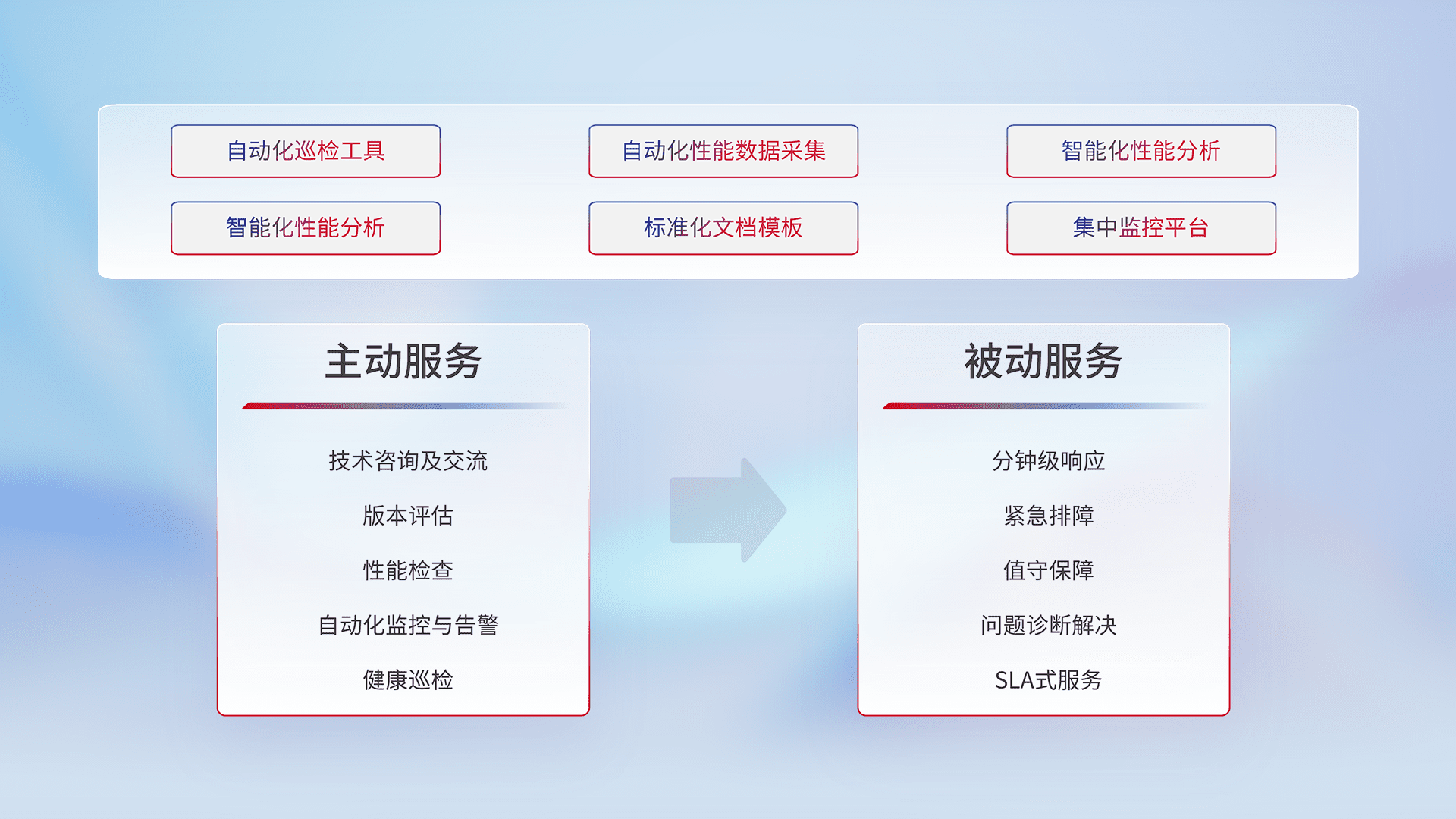 智能化工具和标准化文档,,,,保障服务质量,,提供主动服务(包含技术咨询、、、版本评估、、性能检查、、自动化监控与告警、、、、健康巡检)和被动服务包含(分钟级响应、、、紧急排障、、、值守保障、、问题诊断解决、、SLA服务)。。。。